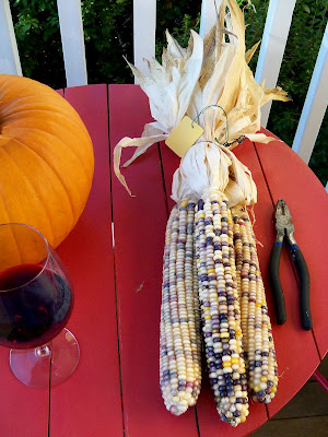 What interesting Indian Corn, those big white ones! I've never seen them. I have three colorful ears on my front door right now too, but I should have tied a ribbon on them like you did.